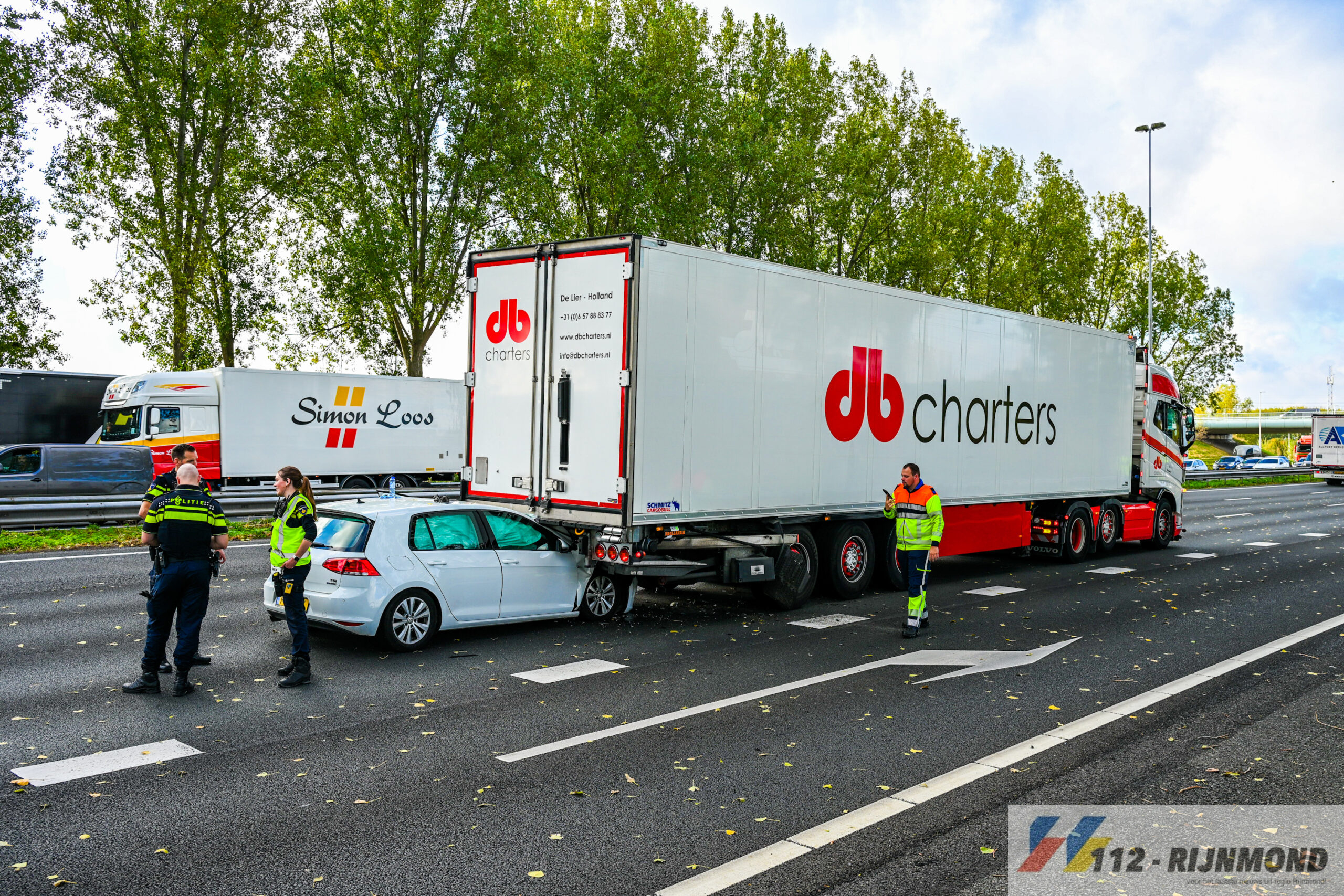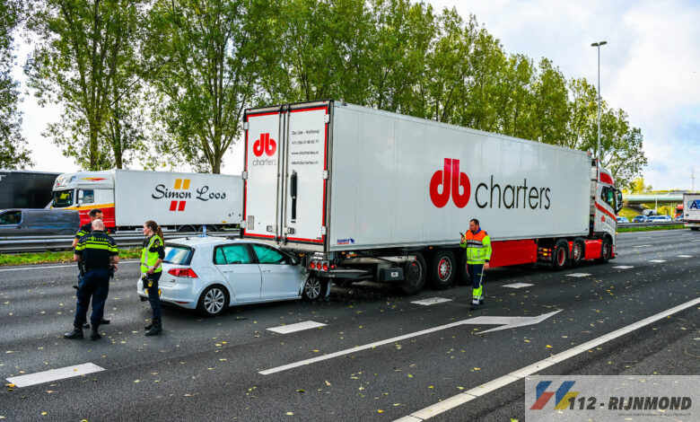 Een deel van de auto was hierbij onder de trailer vast komen te zitten. De bestuurder een 35-jarige man uit Poortugaal is met verwondingen overgebracht naar een ziekenhuis.