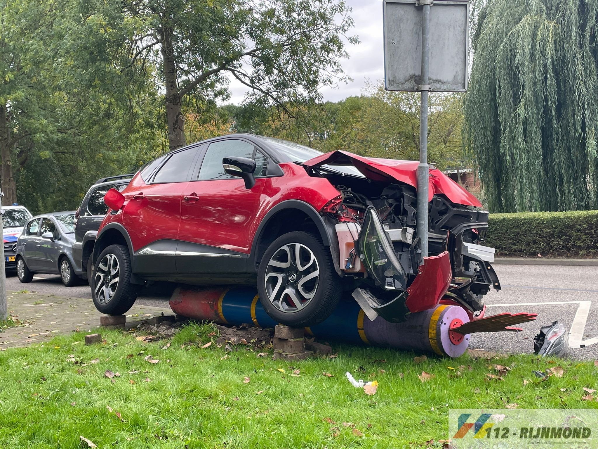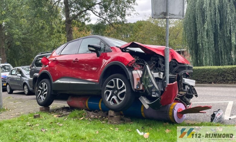 Een bergingsbedrijf heeft de auto op de paal weggesleept. De politie doet onderzoek naar de toedracht van het verkeersongeval.