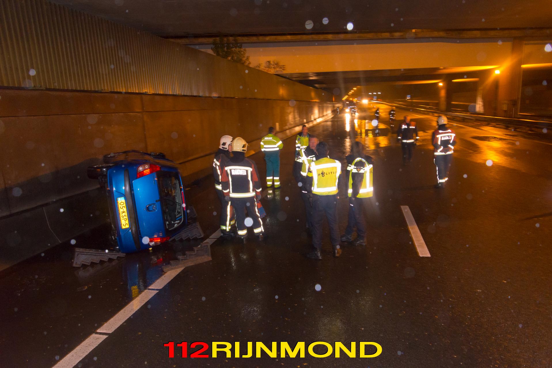 Auto op zijn kant door enorme plas water A20 Nieuwerkerk aan den IJssel