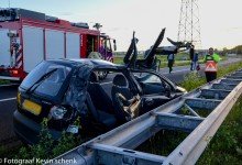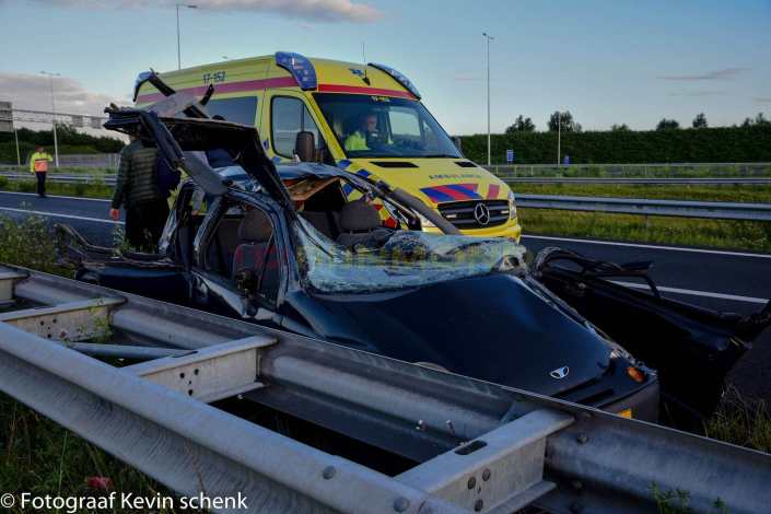 Bij aankomst bleek een auto door nog onbekende reden over de kop te zijn geslagen. Hierna kwam de auto tegen de vangrail tot stilstand. In de auto zaten vier mensen waarvan twee gewond raakte bij dit ongeval. De hulpdiensten schaalde bij aankomst op naar het sein “Middel Hulpverlening”. Samen met het personeel van de ambulancedienst en de traumahelikopter heeft de brandweer de twee gewonden uit de auto gehaald. De twee gewonden zijn met een ambulance naar het ziekenhuis gebracht.