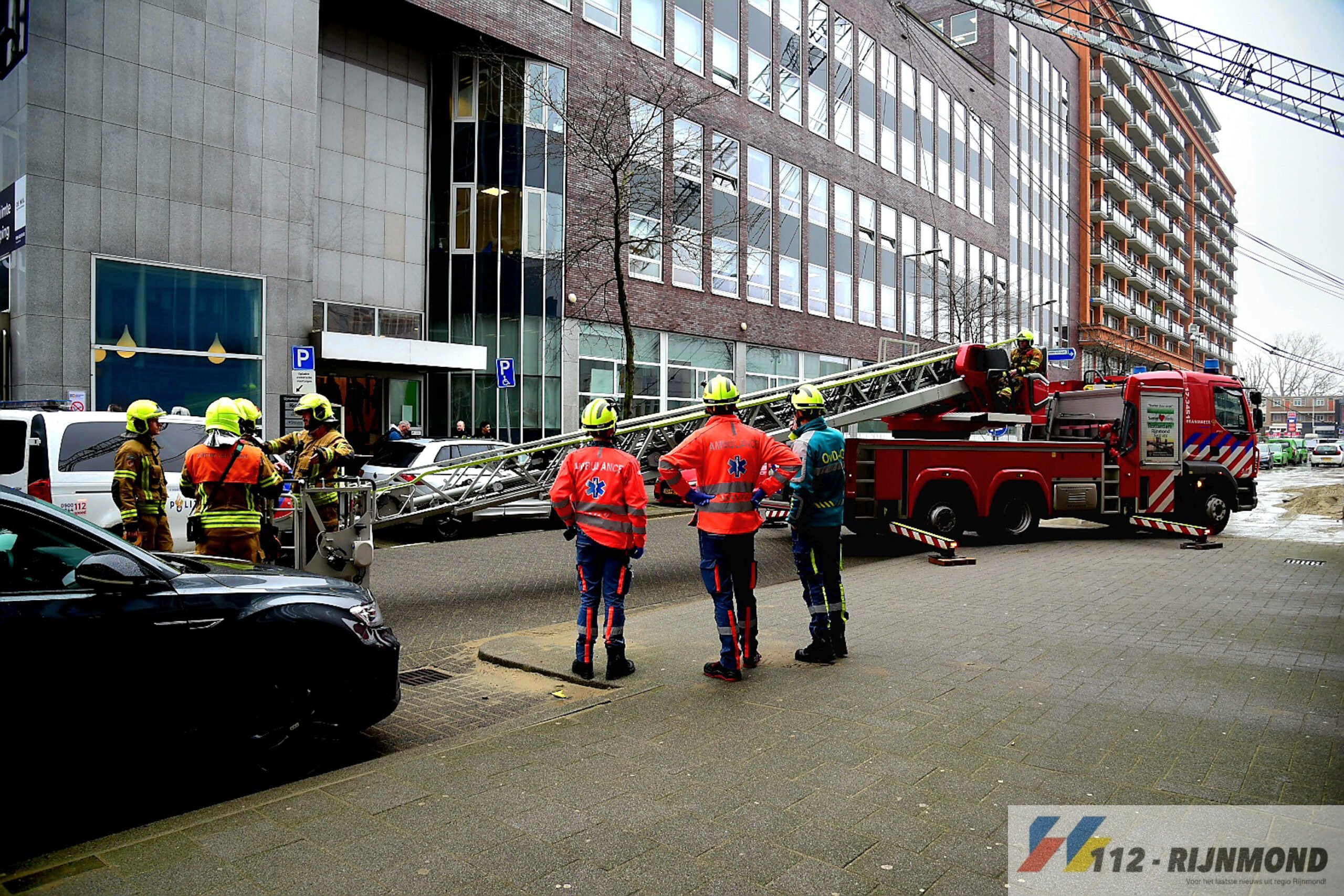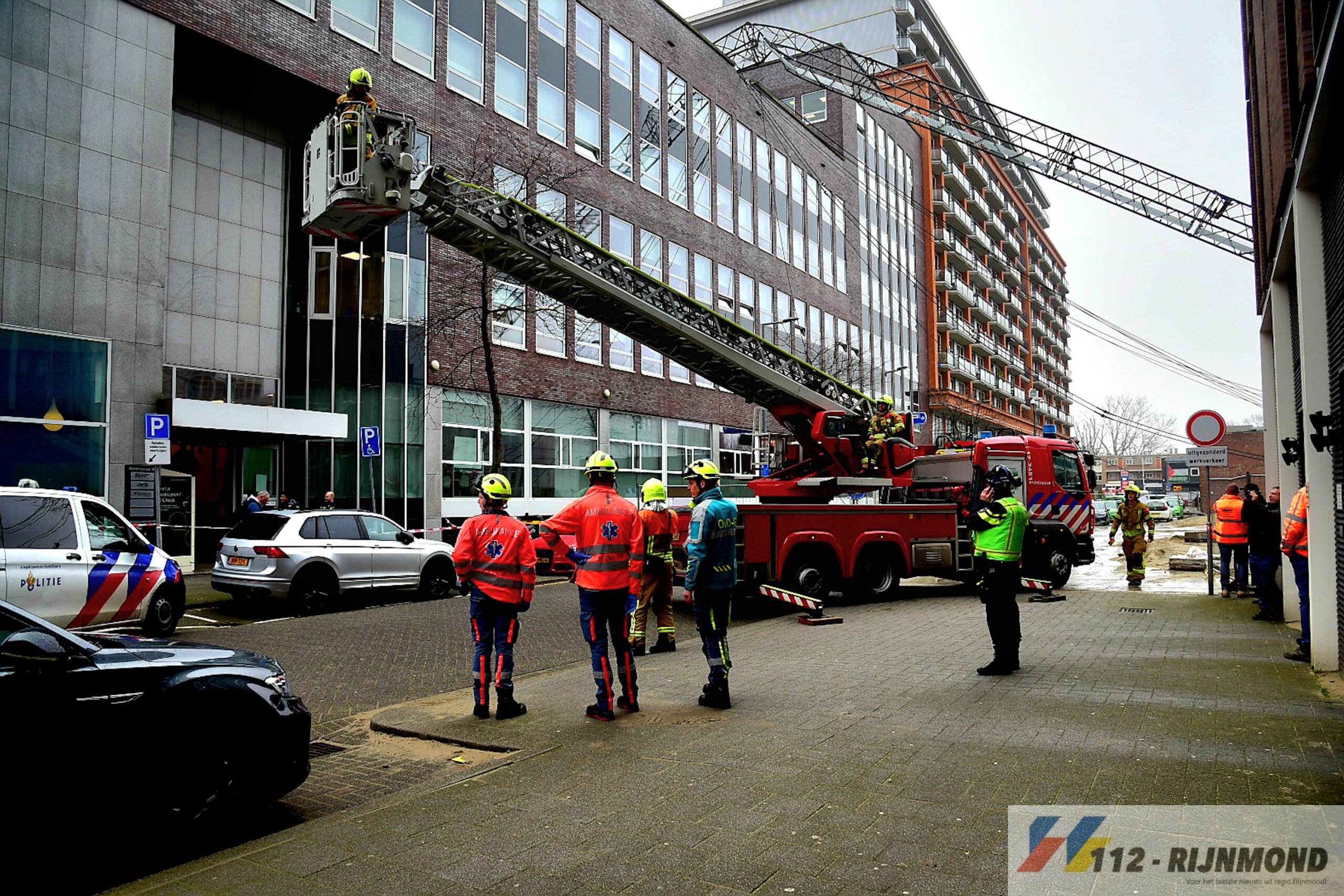 Bij aankomst bleek dat de kraan op het parkeerdek van het kantoorpand terecht was gekomen en naast flinke schrik, er geen gewonden waren.