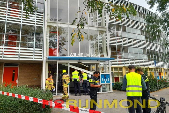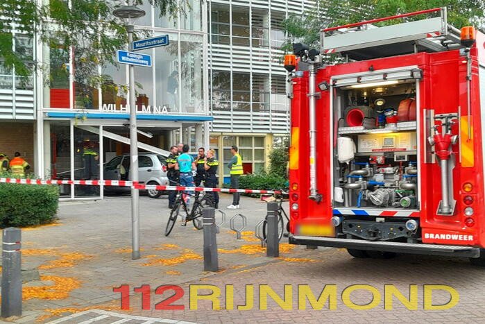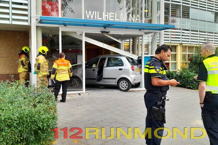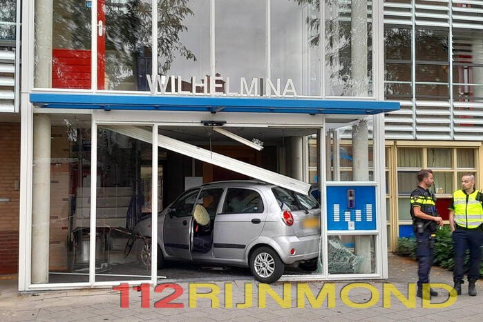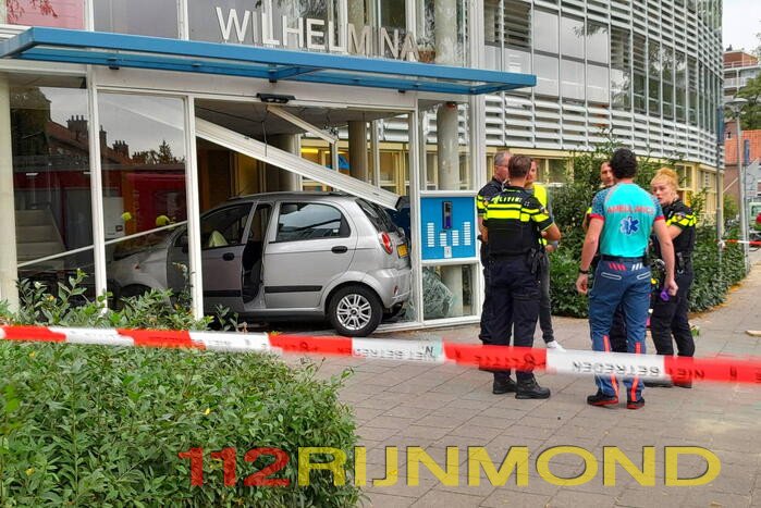 Een automobiliste is met haar voertuig door de entree van een flatgebouw Wilhelmina gereden. De auto kwam tot stilstand in de hal. De vrouw die de auto bestuurde raakte gewond bij het ongeval en werd gecontroleerd door het ambulancepersoneel.