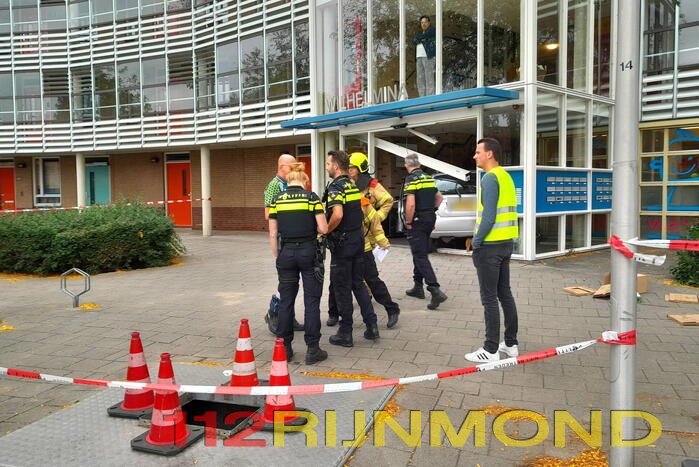 Hoe het ongeval heeft kunnen gebeuren, is niet bekend. De schade is flink en een berger zal moeten komen om de auto uit de hal van de flatgebouw te halen.